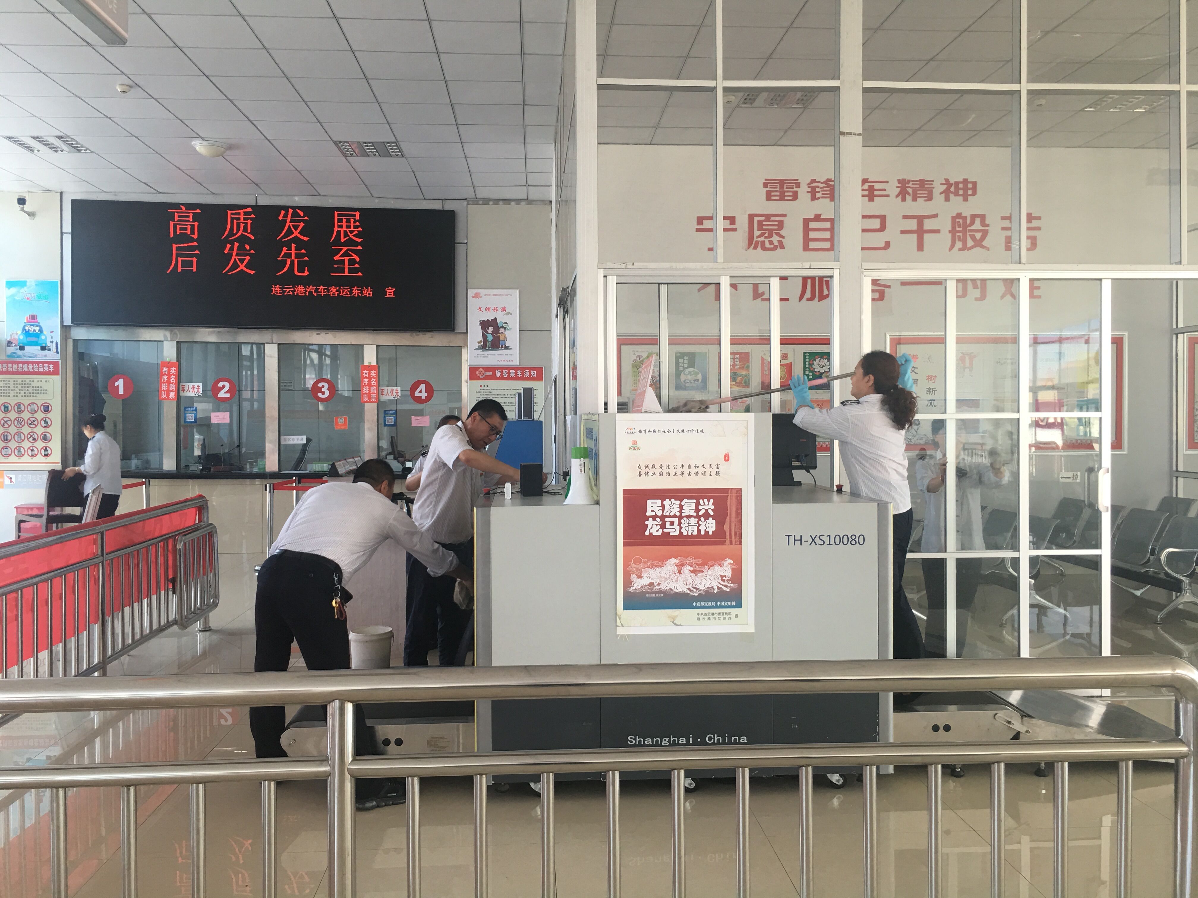 活动对清洗区域进行划分,党员干部和站务人员分工协作,一班组负责站前广场和进站口的玻璃,二班组负责发车区和检票口的玻璃,大家按照分组拿起工具,加入擦玻璃净环境的行动中。大家配合有序,有的拿抹布,有的拿水盆,充分发扬不怕脏、不怕累的优良作风和团结协作的精神,经过将近1个小时的的共同努力,客运东站的玻璃被清理的干干净净,焕然一新。