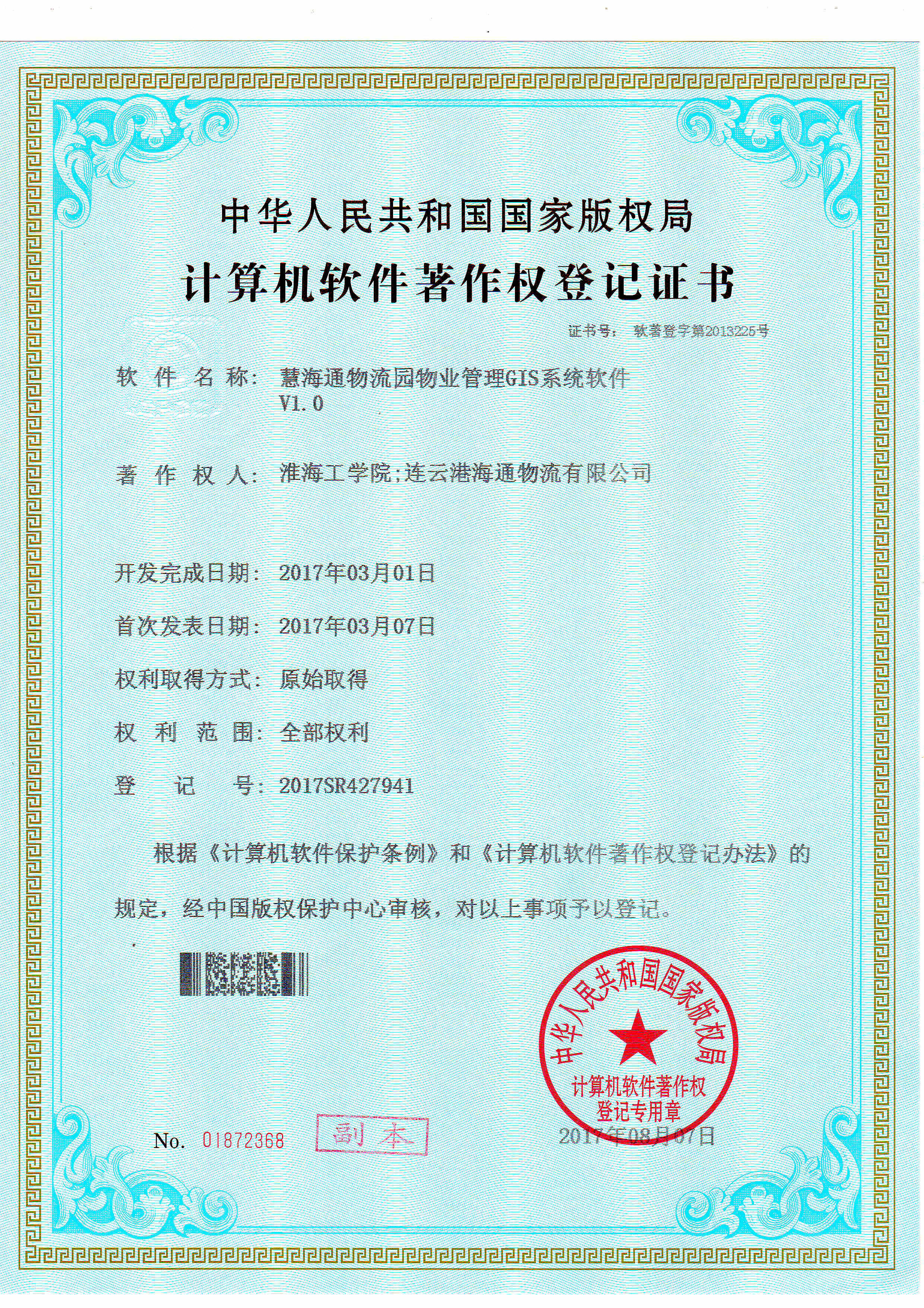 8月28日,经国家版权局审核,连云港海通物流有限公司与淮海工学院合作申请的《汇海通空间数据融合处理软件V1.0》、《汇海通物流园物业管理GIS系统软件V1.0》符合《计算机软件保护条例》和《计算机软件著作权登记办法》的相关规定,被认定为原始取得,并获得国家版权局颁发的《计算机软件著作权登记证书》。标志着物流公司在信息系统中形成持续创新机制,保护公司自主知识产权,更对内外支持服务水平和公司核心竞争力提升起到推动作用。