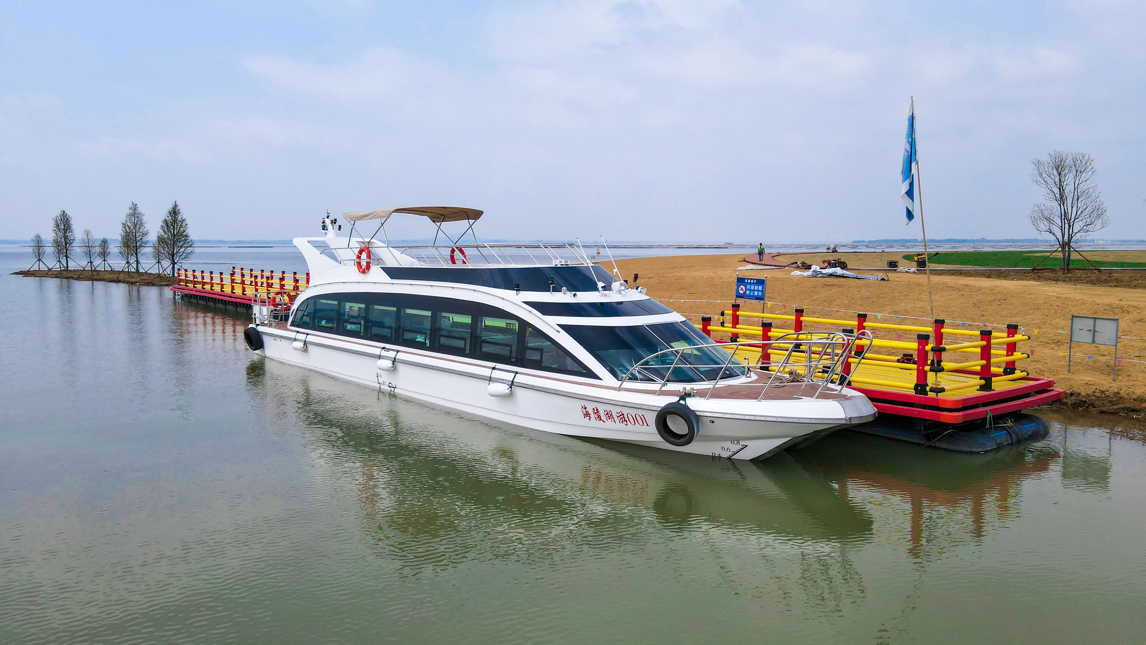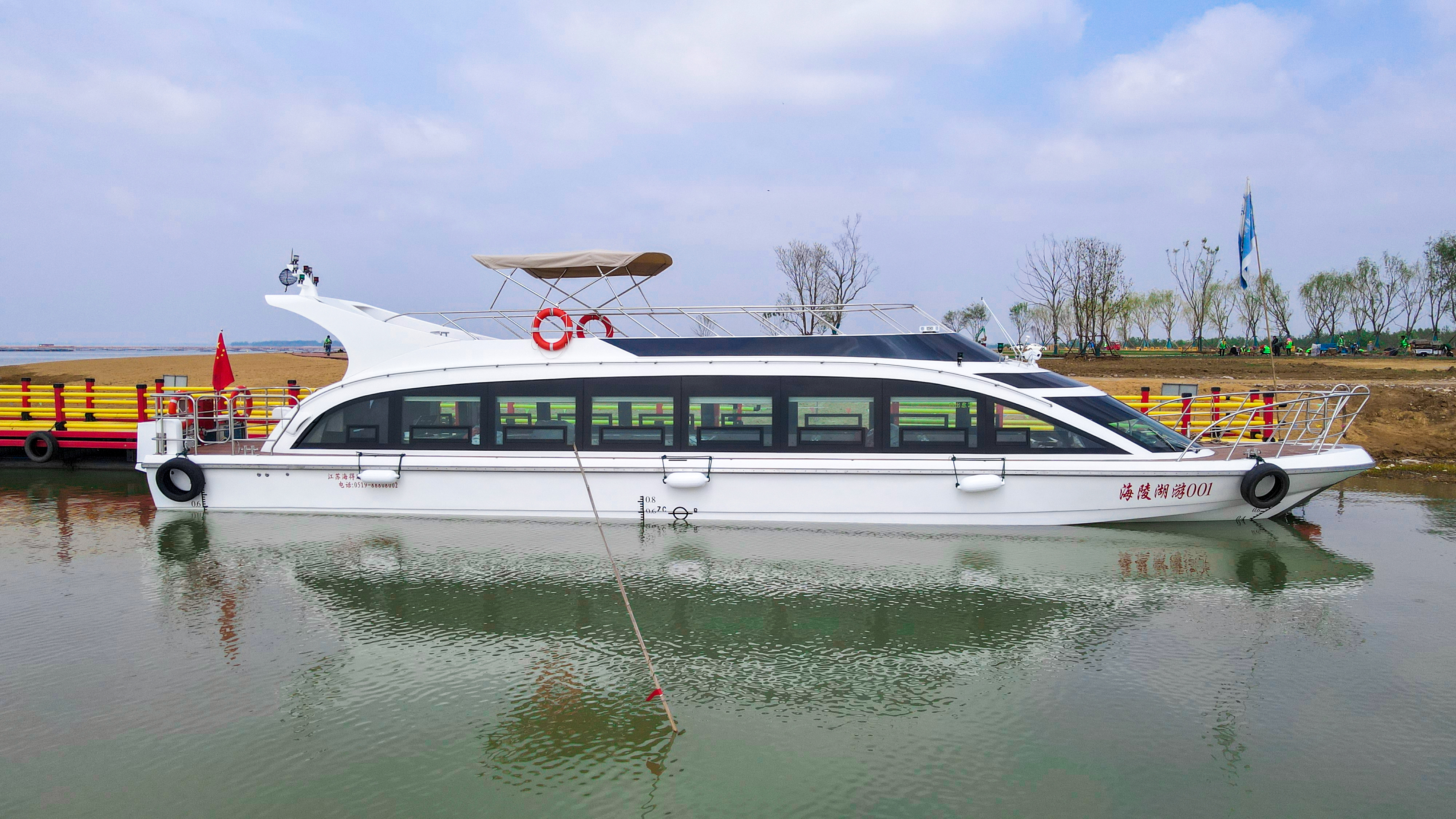 该艇总长20.4米,可容纳52位乘客,设计航速为17km/h。温润洁白的船身搭配黑色的玻璃窗,远远望去,恰似一只蓄力欲翔的天鹅。艇身线型紧凑,流畅优美,动感十足,将逐渐成为婚纱摄影、网红打卡景点。艇内布局讲究,采光充分,保证空间的开阔性、舒适性,既能满足商务接待需求,又适合亲朋好友小聚。