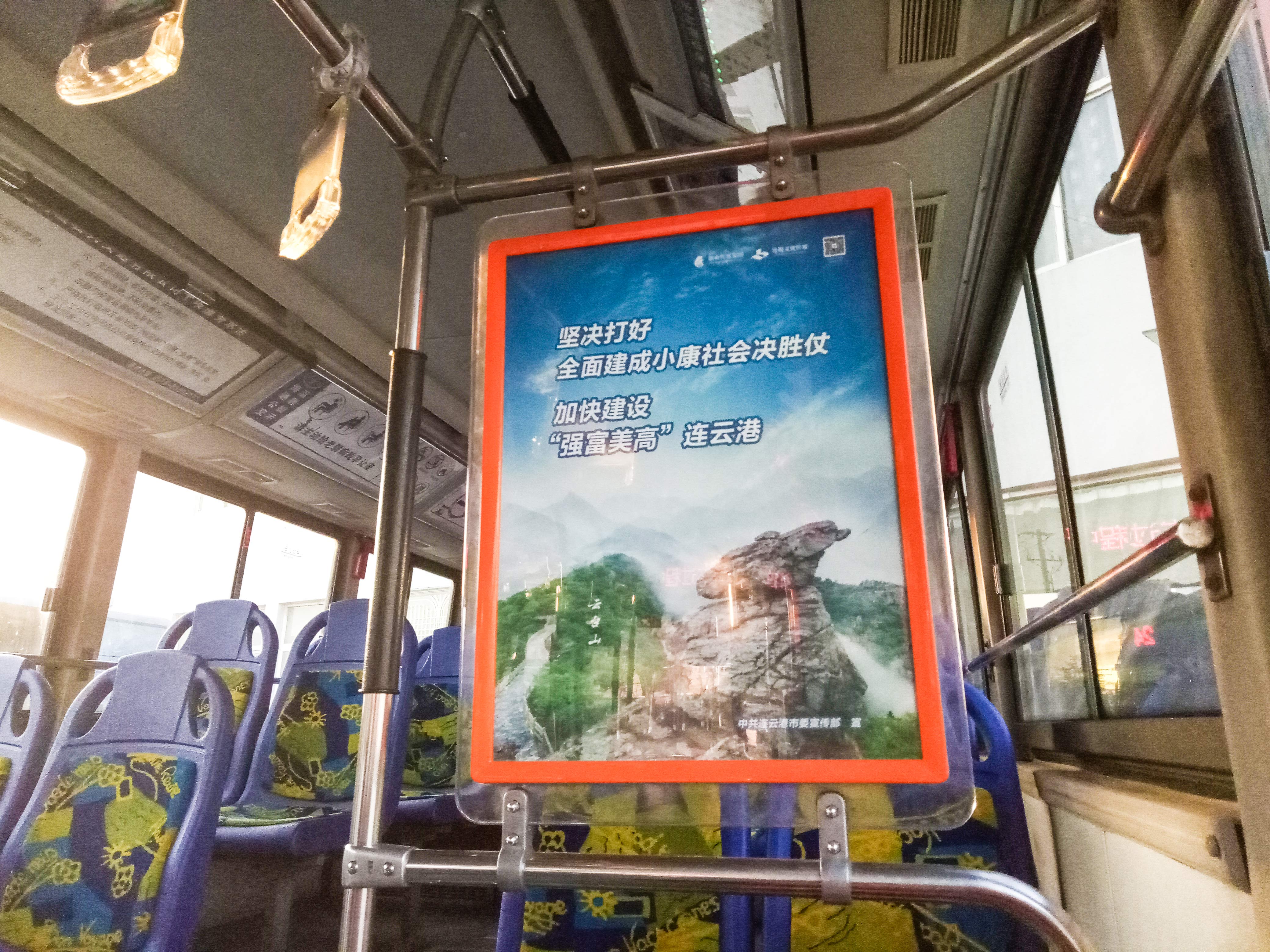 十九大主题宣传公交车以连云港独特的山海风光为背景,车身印有“迈进新时代 开启新征程 续写新篇章”等标语,车内在扶手、车厢、座椅、风道展板等30多处设置有十九大精神标语、社会主义核心价值观的内涵阐释,乘客在乘车时可以很自然地看到标语,感受到十九大精神所在。