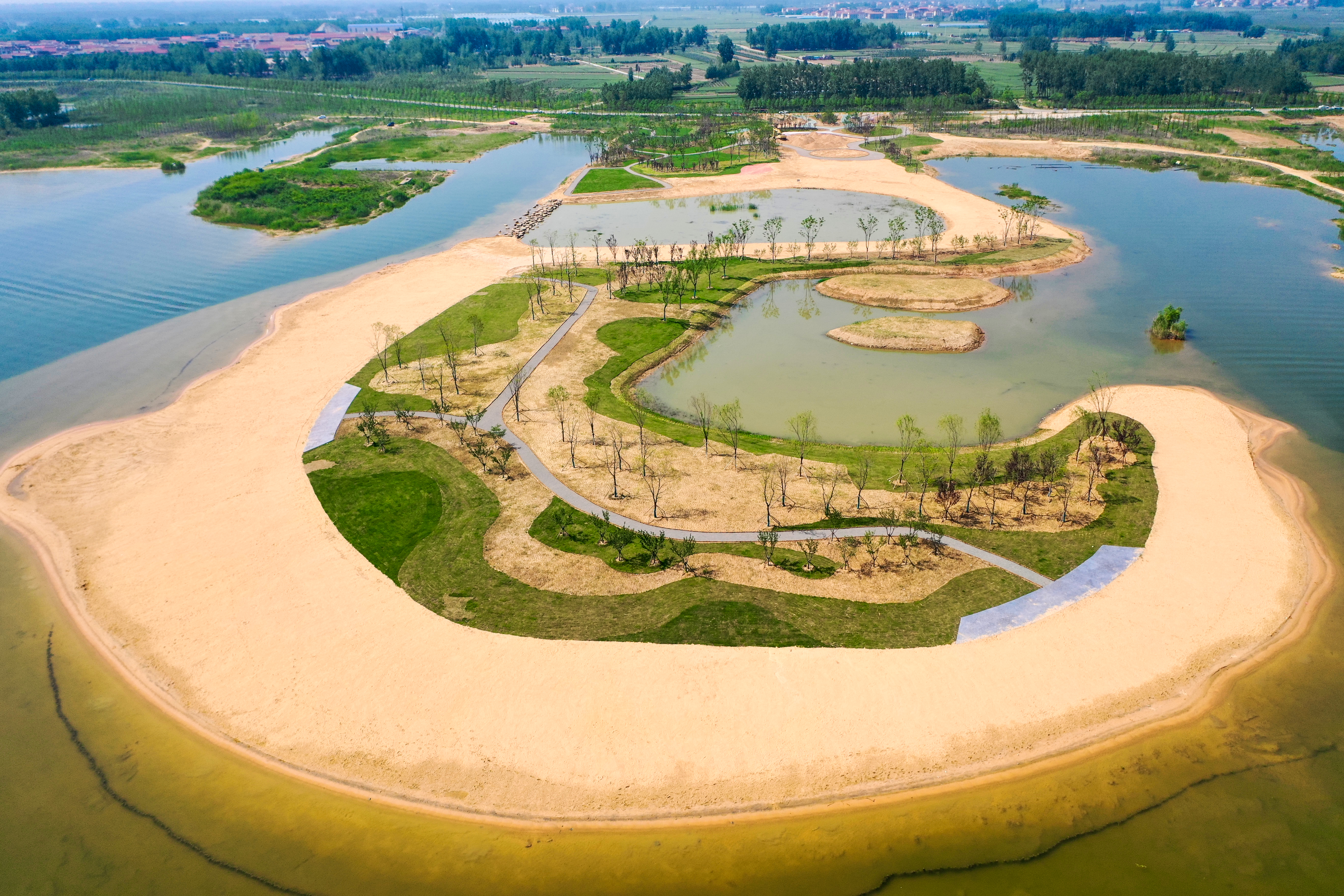 “黄金沙滩”围绕“沙”的元素设置了“趣味沙世界”主题区,以沙雕展示为主。“mini亲子水世界”主题区,利用原有滩地的凹地,以生态塘+浅水沙滩的形式设计了一处可观、可玩的亲子互动沙滩区。“房车营地”配有可租借帐篷、小木屋、运动游乐设备等露营设施。“星空露营基地”设置在杉树林中,三面环水,和海陵湖秀丽的湖光相互映衬。“月亮湾”为“黄金沙滩”的主沙滩区,因其月牙的造型而得名,是欣赏海陵湖风光的最佳区域。目前,沙滩地形塑造、绿化景观、生态岛、溢流坝等主体工程已全部完成,栽植黄山栾树、朴树、乌桕、晚樱、碧桃、垂柳等共计681棵,绿化复绿面积达13000平方米,铺设场内道路955米,回填内外湖沙滩粗细沙共计21416方,打造内外湖沙滩共计16000平方米,构建生态岛600平方米,砌筑生态拦水坝50米,打造入口生态对景墙147平方米,正在开展沙雕、停车场施工,驿站、茅草屋、公厕等配套设施已定制生产,预计6月中旬完成主游览区建设,端午节前投入运营。