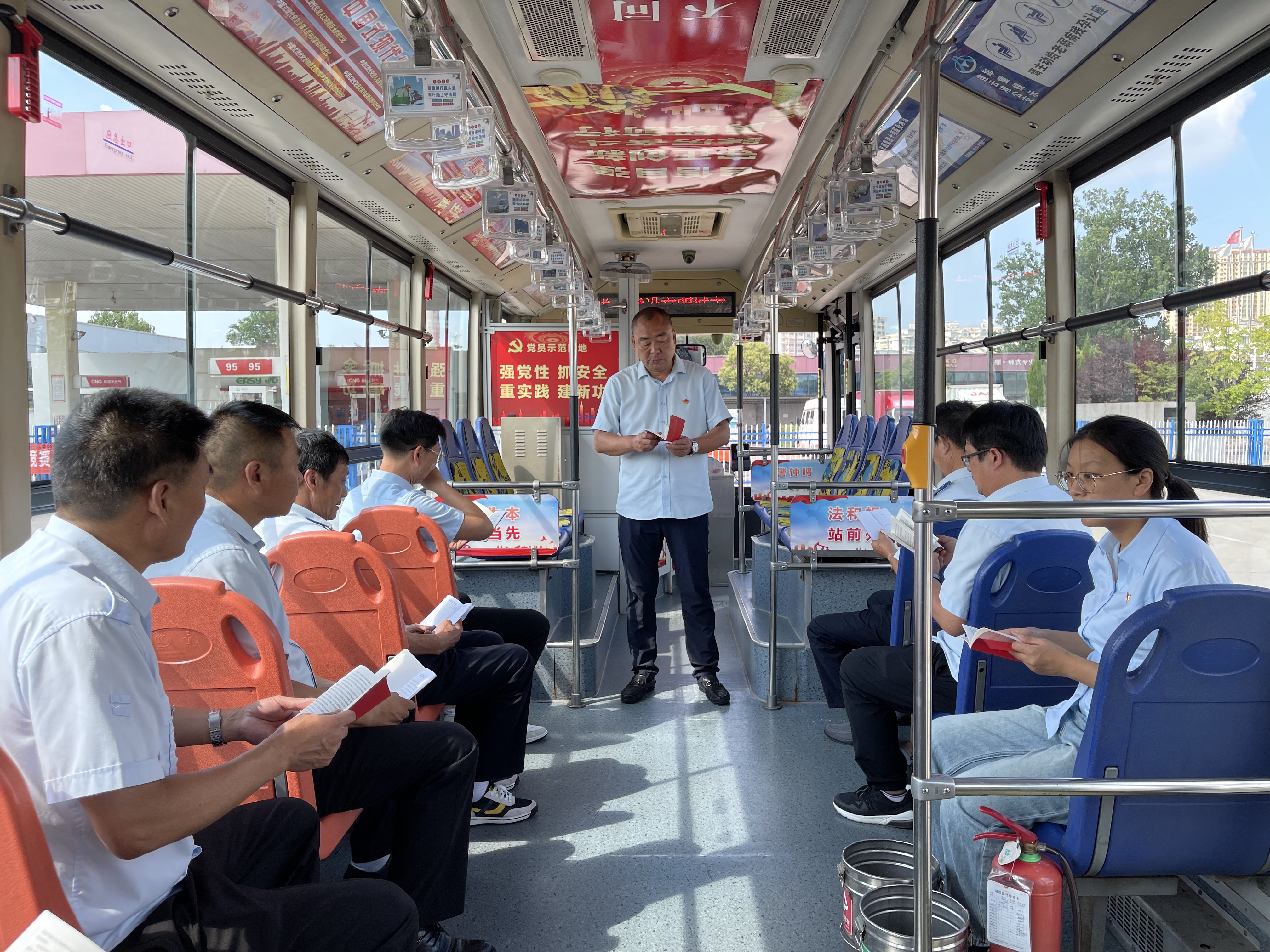 在庄刘柱的带领下,大家走进31路苏GA6126“党建+安全”主题文化车厢,庄刘柱分别领学了《习近平新时代中国特色社会主义思想学习纲要》(2023年版)第一篇《中国共产党领导是中国特色社会主义最本质的特征——关于当代中国的最高政治领导力量》和《中国共产党章程》第七章《党的纪律》。学习最后,大家现场学习了车厢内外党的二十大精神和习近平总书记关于安全生产工作的重要论述精神。