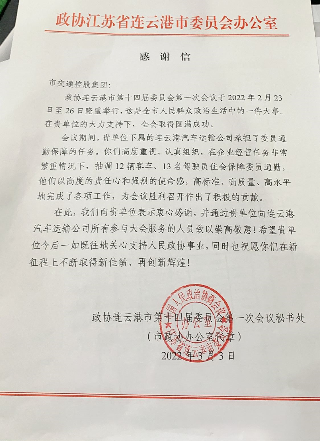 近日,从市交通控股爱游戏app最新版下载,爱游戏(中国)获悉,政协连云港市第十四届委员会第一次会议秘书处发来感谢信,对汽车公司在第十四届委员会第一次会议中的交通保障工作表示衷心感谢,对公司所有参与大会服务的人员致以崇高的敬意。