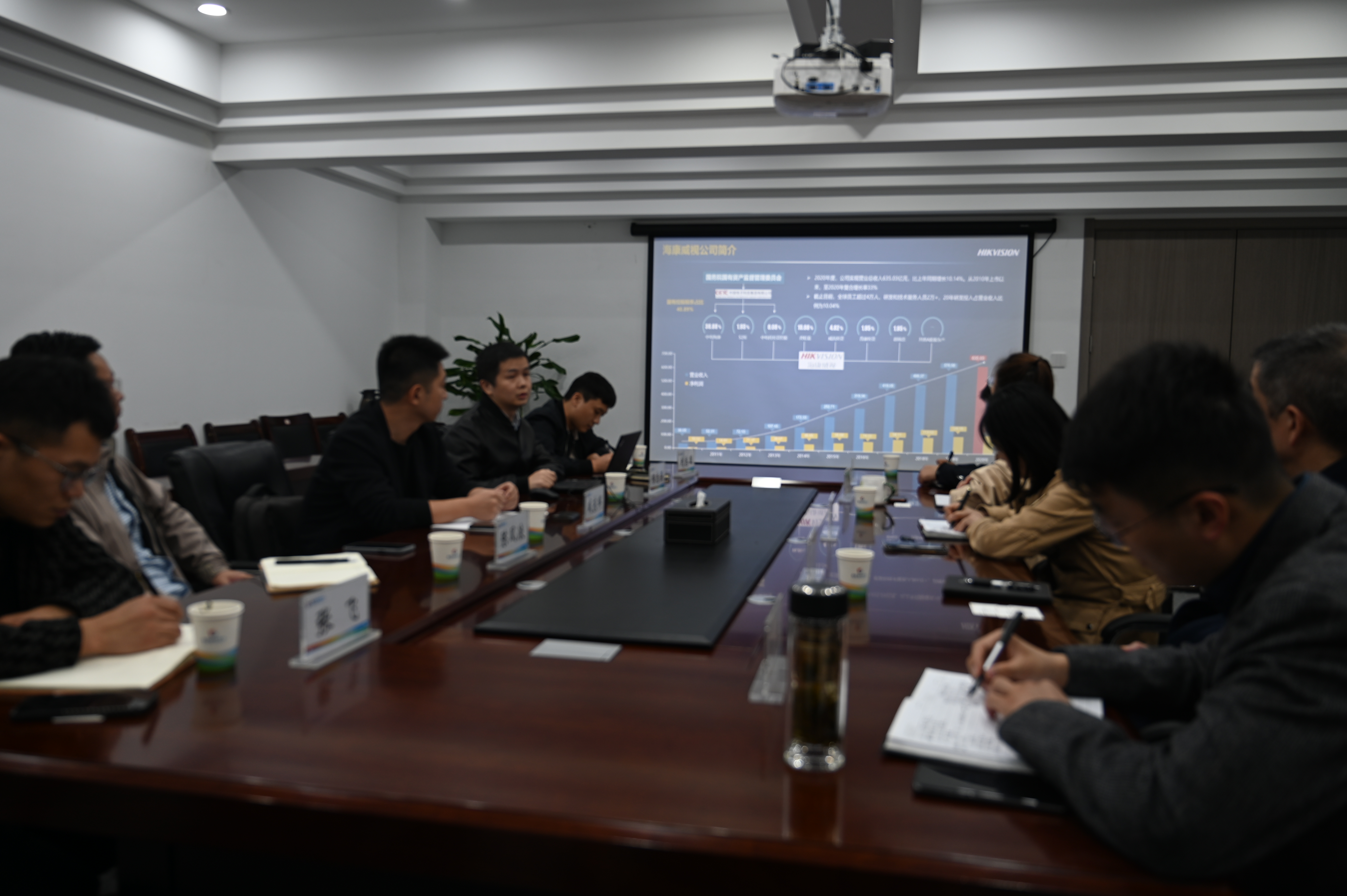11月8日,海康威视数字技术股份有限公司市场部总监咸东辉、产品总监陈志强、投资部总监刘志国、连云港分公司总经理陈风浪一行来到市民卡公司进行智慧停车项目的交流座谈,市民卡公司党支部书记、总经理叶星妍、副总经理朱晓雯参加会议。