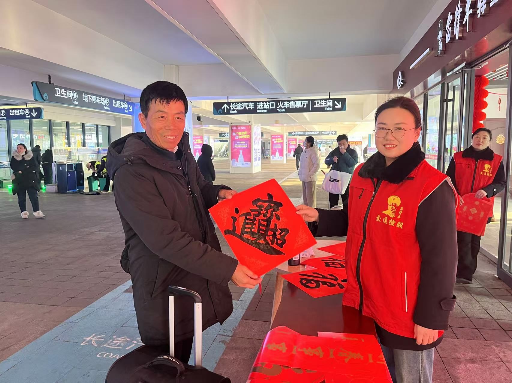 除了现场书写的春联,志愿者们还将一些提前精心准备好的精美春联送到旅客手中,让更多的人能够收到这份新春的祝福。一时间,整个“雷锋车”驿站前充满了欢声笑语,洋溢着浓浓的节日气息,让每一位过往的旅客都感受到了家的温暖。