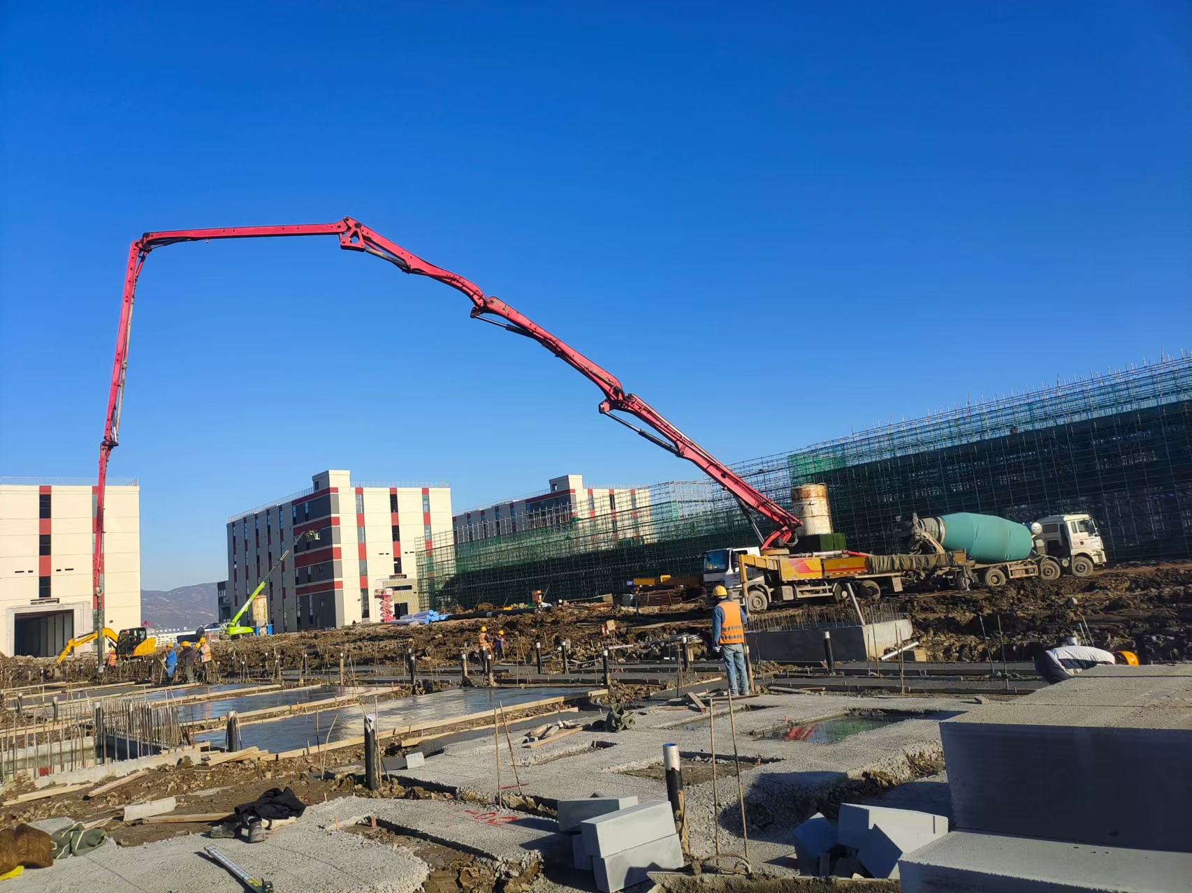 此次混凝土基础垫层浇筑施工, 是本项目单项工程纺丝车间的关键部分之一,基础垫层作为建筑物底层的重要组成部分,其质量也直接影响到整个结构的安全与稳定。为确保本次浇筑顺利完成,生产过程中, 基地商混站全体员工齐心协力、紧密配合,项目团队不断优化生产方案,落实材料保供,强抓文明生产,从原料筛选到搅拌出料,每一个环节都严格把控,以保障混凝土的高性能和稳定性。同时,积极与施工单位协调, 成功克服现场泵车架设困难、场内道路通行受限等问题,如期完成本次混凝土浇筑任务,为项目后续施工打下良好基础。