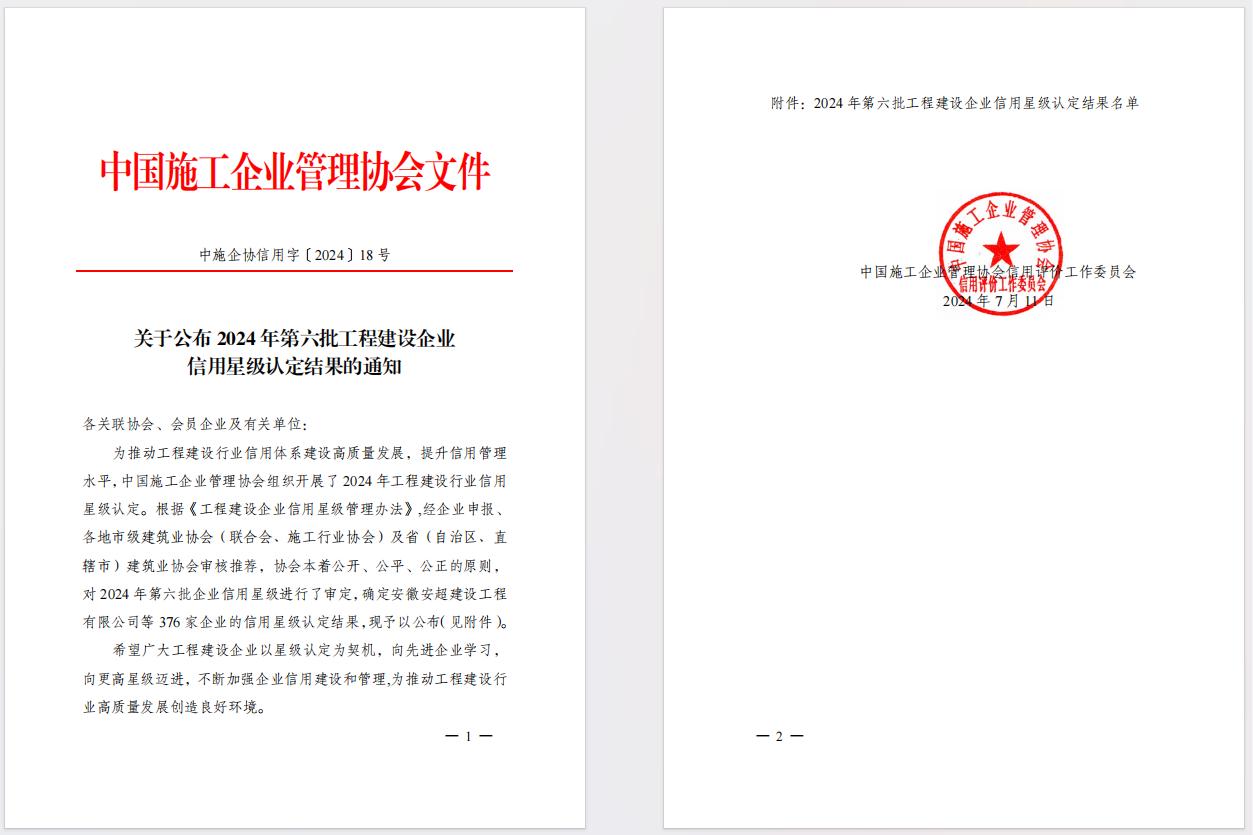 近日,从中国施工企业管理协会(简称“中施企协”)获悉,海建公司入选2024年第六批工程建设企业信用10星级认定名单,较之22年再增2星。