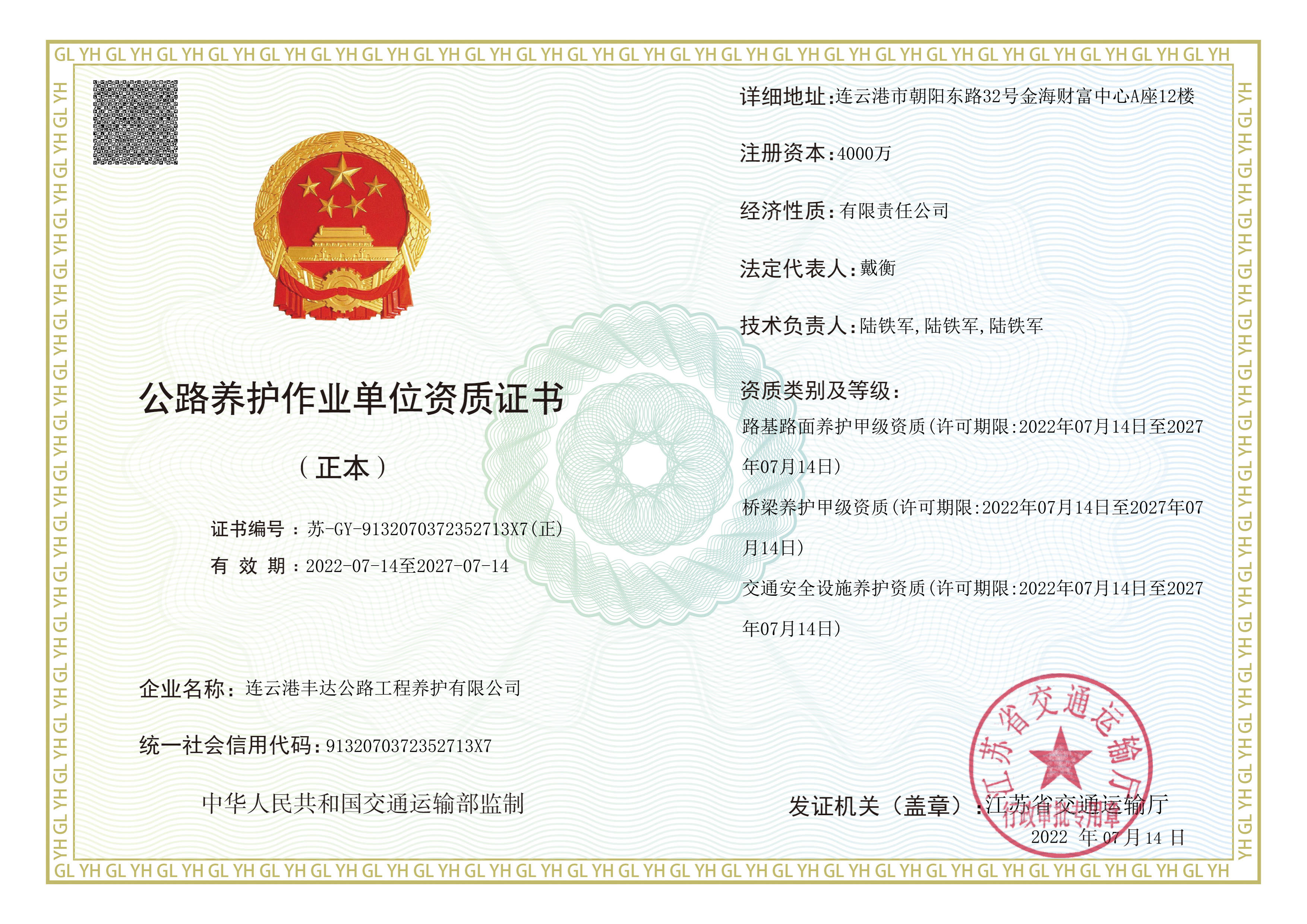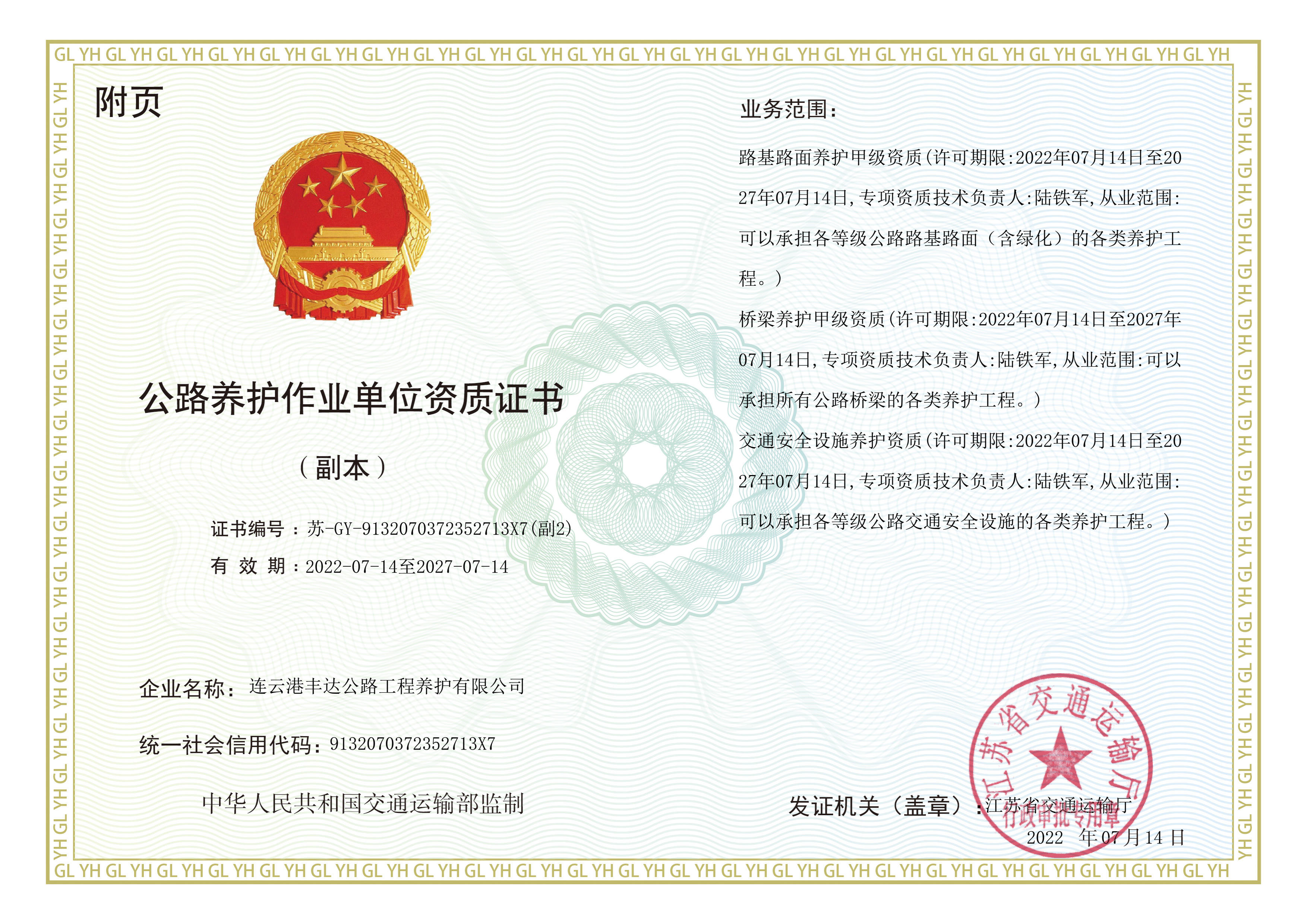 7月14日,丰达公司此次申报的公路养护作业单位资质“路基路面甲级、桥梁甲级、交通安全设施”三个专业顺利通过江苏省交通运输厅核准,申报成功。